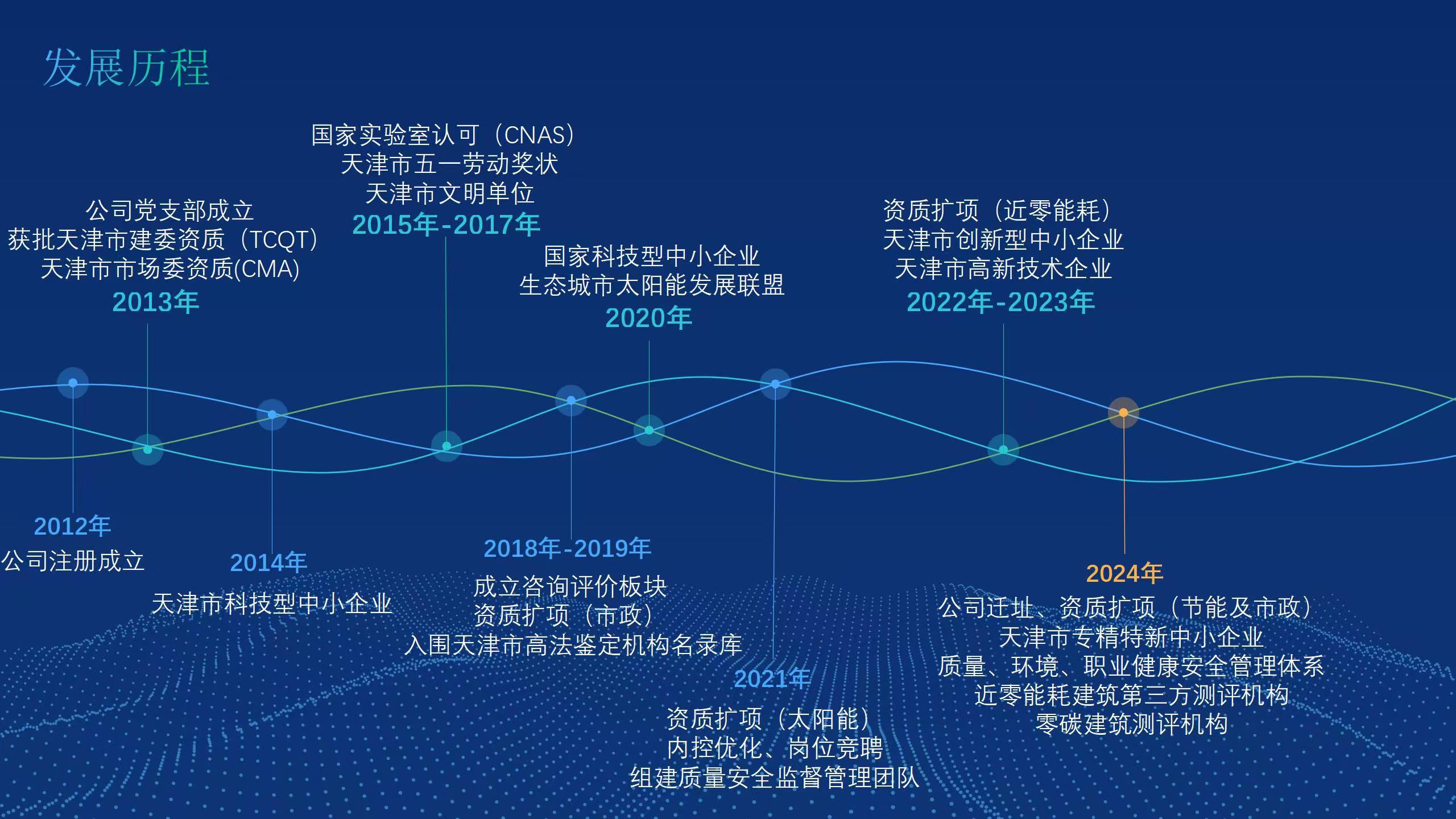 公司發展至今,技術能力不斷拓展和提升。現已具備檢驗檢測機構資質(簡稱CMA)、天津市建設工程質量檢測機構資質、中國合格評定國家認可委員會實驗室認可資質(簡稱CNAS)等資質。同時,公司已被認定為高新技術企業、天津市專精特新中小企業、濱海新區首家近零能耗建筑第三方測評機構。公司主要從事建筑材料及構配件、主體結構及裝飾裝修、建筑節能、道路工程等檢驗檢測服務,以及綠色建筑節能評估、近零能耗、房屋質量安全鑒定等咨詢服務業務。公司在冊員工為60人,其中高級職稱30名,中級職稱20名,初級職稱10名。